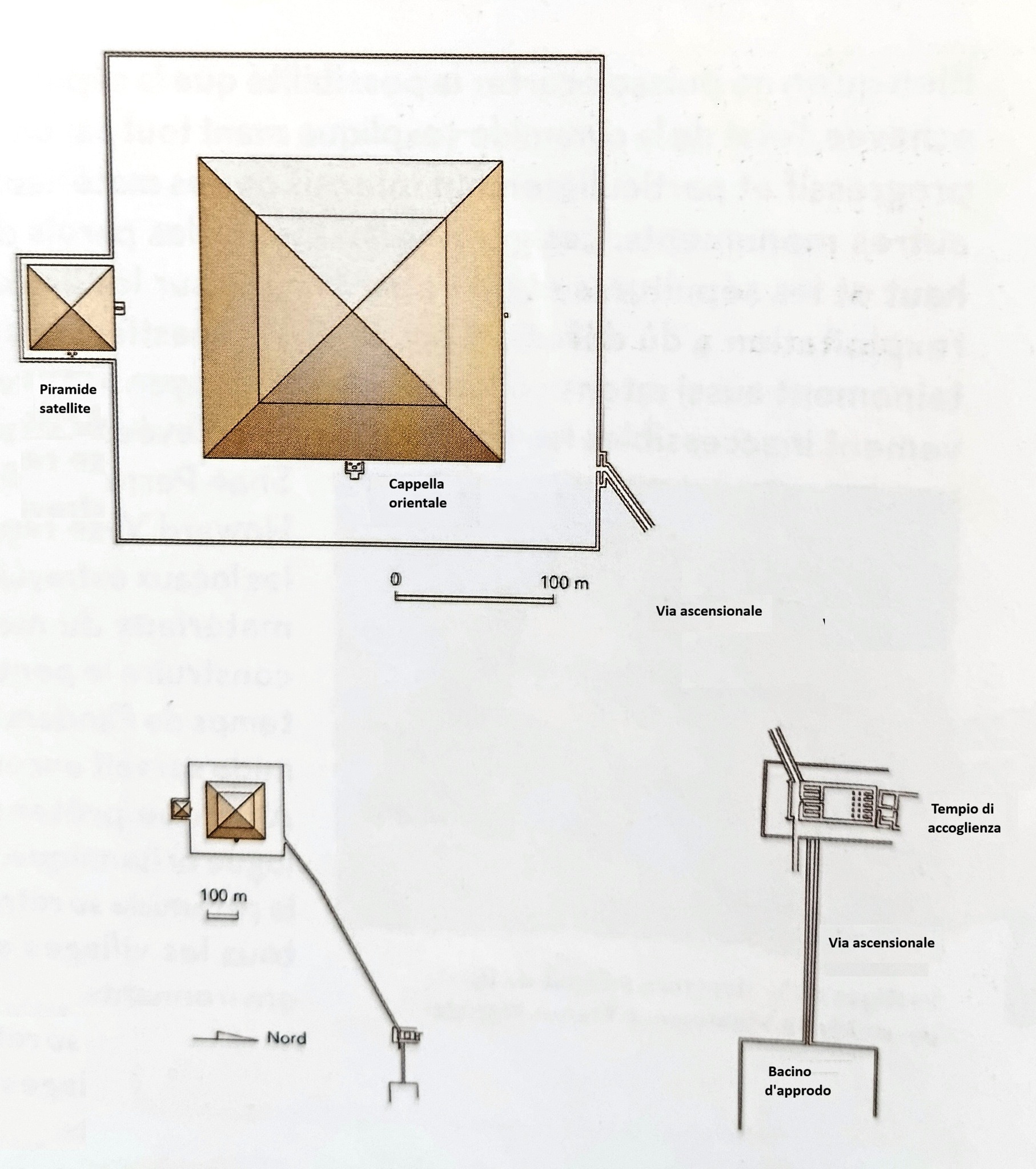 Un recinto in pietra, alto circa 2 metri, delimitava uno spazio sacro intorno alla piramide. Una piccola piramide satellite, la prima del suo genere, fu edificata in posizione decentrata a sud così come una mastaba sul versante settentrionale. Di fronte al tempio funerario, una via processionale collegava l’unico ingresso a un piccolo tempio situato ai margini della valle. Lunga circa 210 metri, questa strada si presentava come una semplice via di comunicazione a cielo aperto delimitata da due muri paralleli: niente che possa, anche lontanamente, essere paragonabile alle gigantesche strade ascensionali che sarebbero state realizzate sotto il regno di Khufu.