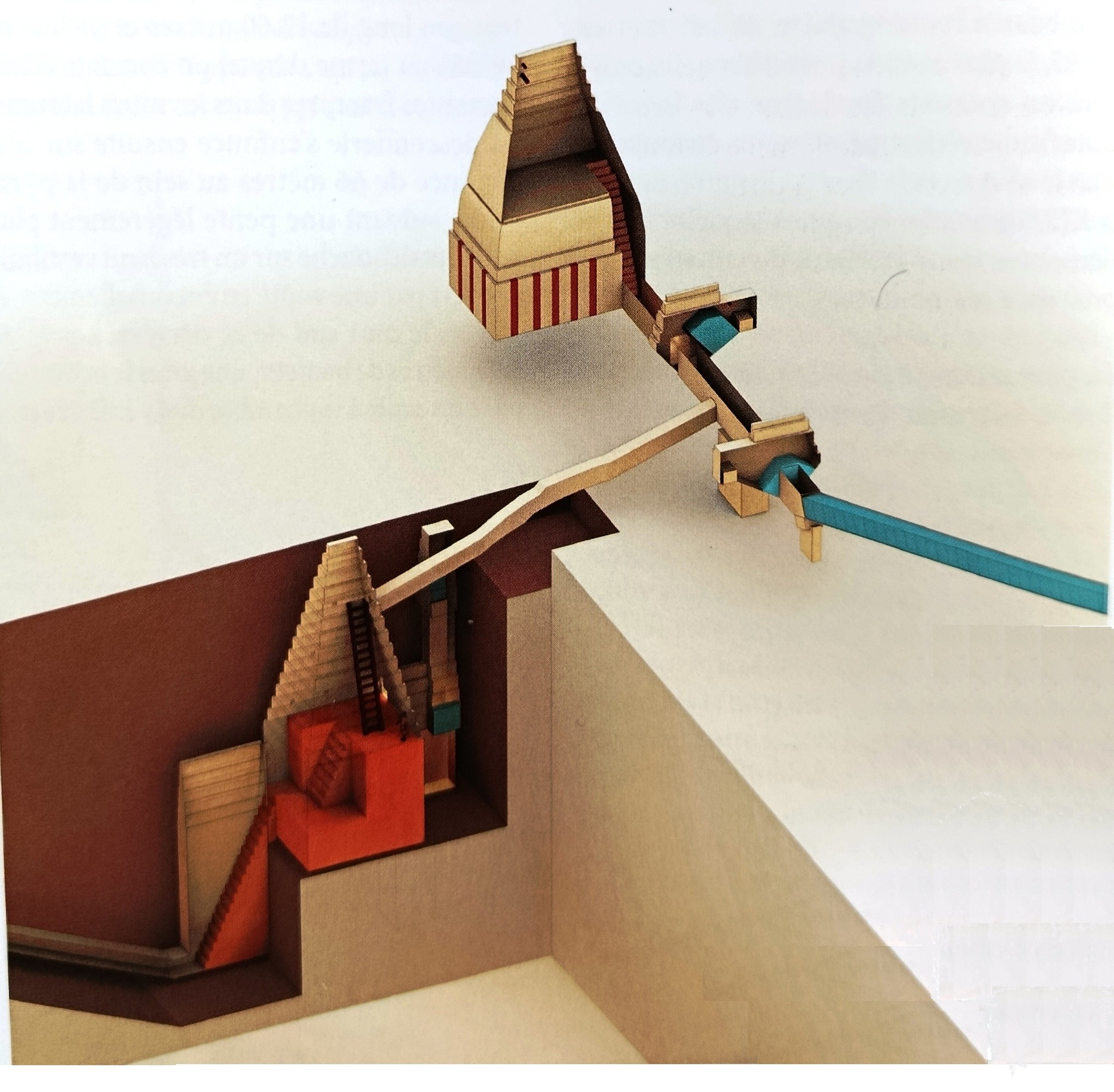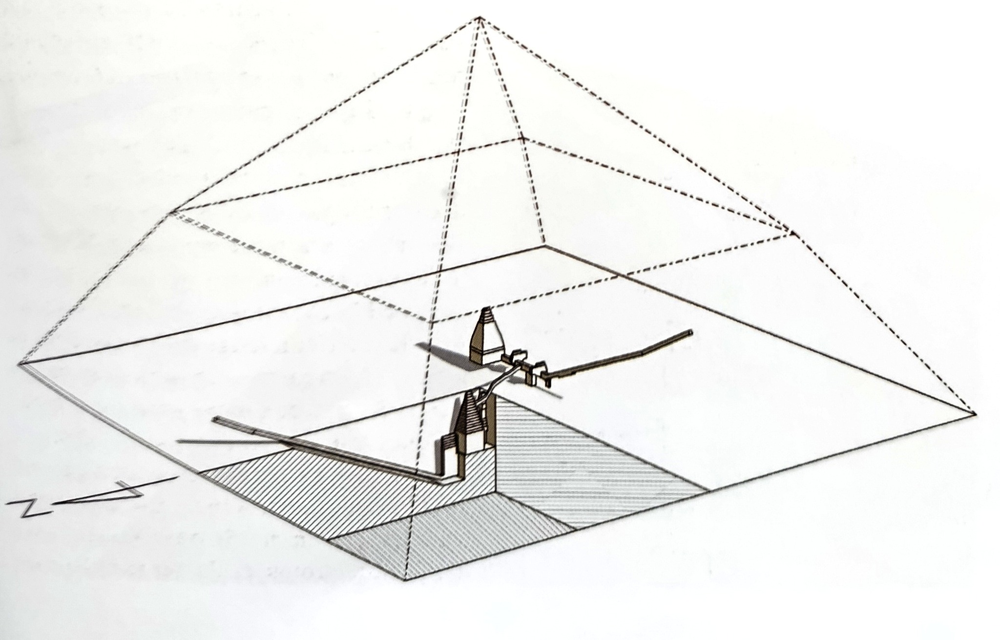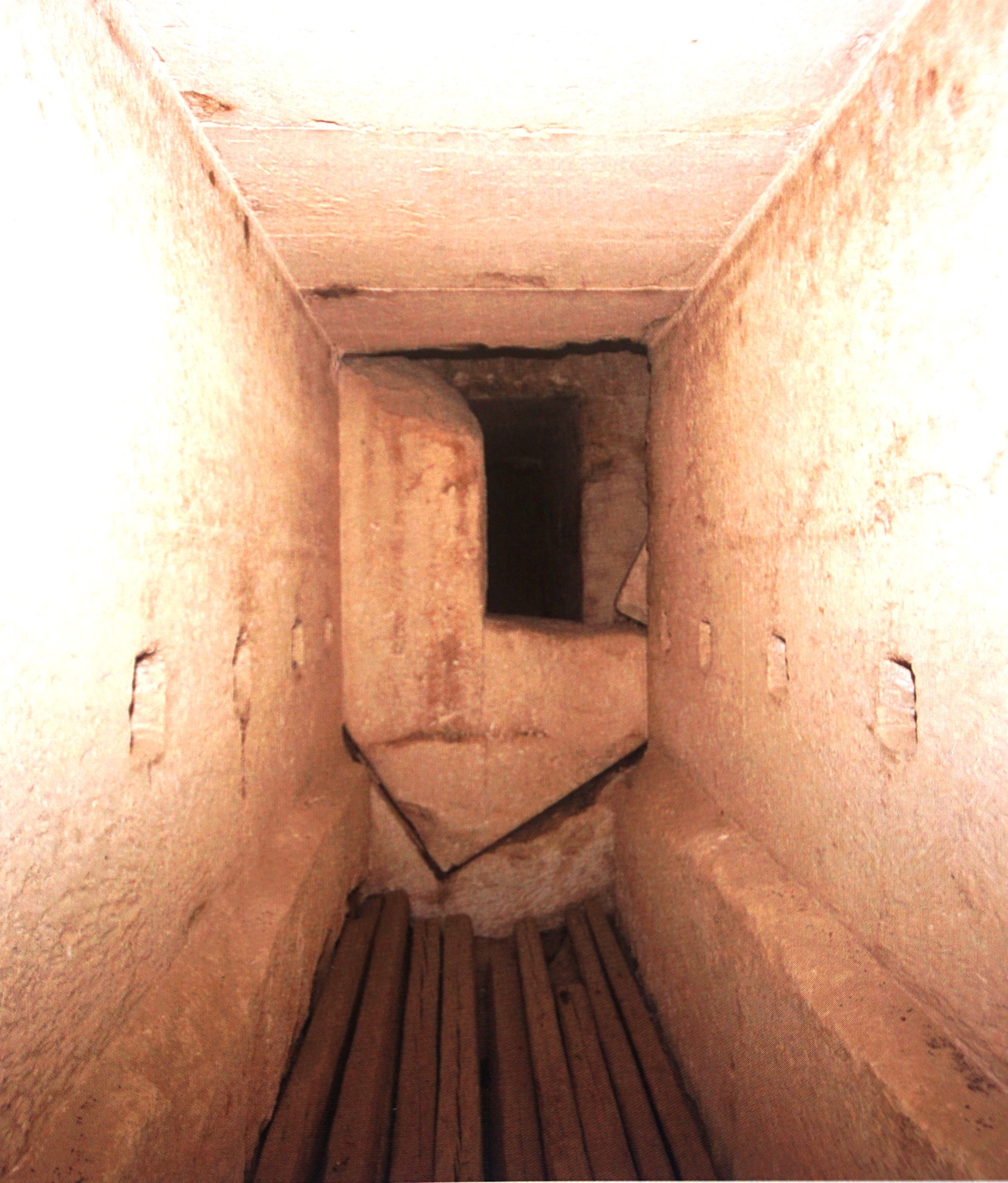 Secondo le tradizioni religiose più antiche riguardanti la vita ultraterrena del sovrano, la dimora mistica era situata nelle viscere del mondo sotterraneo, per cui la più bassa delle tre camere doveva essere collocata in profondità nella roccia come nel caso del sepolcro di Djoser. L’inclinazione del corridoio della tomba, coerentemente, fu determinata dall’esigenza di disporre di un passaggio senza deviazioni puntato direttamente verso le stelle circumpolari. Si iniziò dunque a scavare in profondità, sotto il livello del suolo, per giungere all’uscita posta sulla facciata settentrionale poco più in alto della base della piramide. La camera centrale è simbolicamente connessa all’ascesa del re al cielo, rappresentato dalla camera superiore, per quanto questa (intendo l’ascesa), sia strettamente legata anche alla direzione seguita dal corridoio della tomba (Immagine n. 20).
