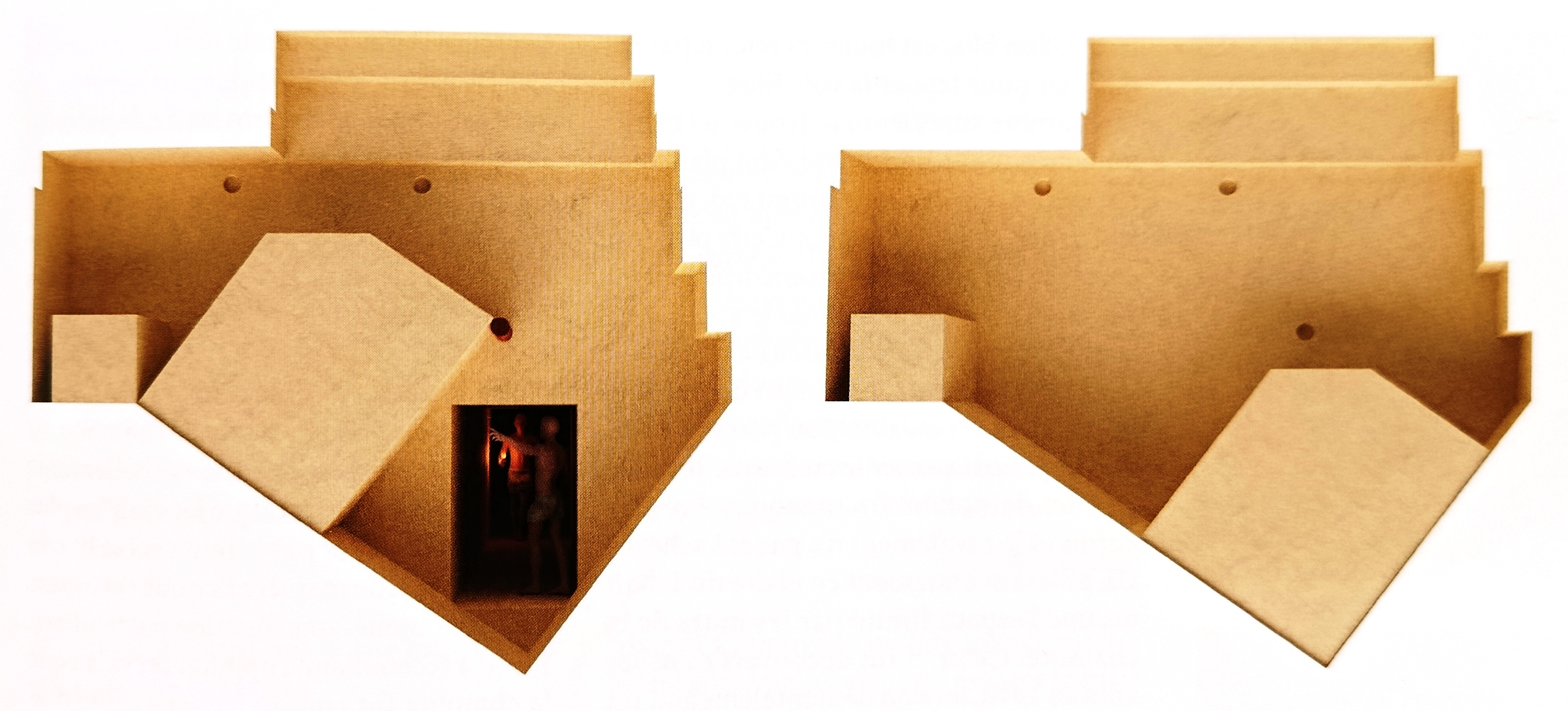 Quest’ultimo conduce a due anticamere, anch’esse in pessime condizioni, disposte una di seguito all’altra. Si tratta di ambienti di dimensioni molto modeste (2,60 metri di lunghezza per 2,20 metri di larghezza) e con un’altezza appena sufficiente a permettere di tenersi in posizione eretta. Nel 2000, i ricercatori francesi Gilles Dormion e Jean-Yves Verd’hurt hanno scoperto l’esistenza di due volte a sbalzo che scaricano i soffitti di queste due stanze (Immagine n. 17).