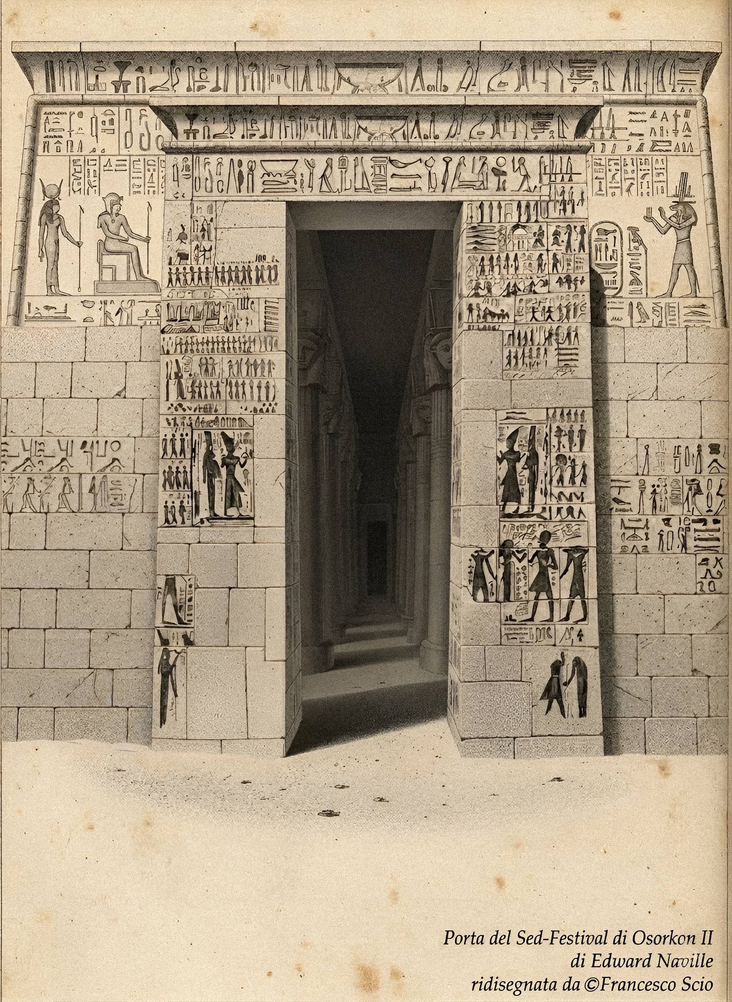 Numero Identificativo: E 10592. Oggetto: Blocco murario. Materiale: Granito Rosa. Dimensioni:Altezza: 125 cm; Larghezza: 163 cm; Spessore: 55 cm; Peso: 2460 kg. Descrizione:scena della festa di Sed; re (2, corona bianca, mantello cerimoniale, con flagello, scettro heka); serie di divinità; Ra (dio con testa di falco); Atum; Shu; Tefnut; Geb; Nut; Osiride; Horus (dio con testa di falco); Seth; Iside; Nefti; Bastet (dea con testa di leone); personificazione del ka reale; uomo (in piedi, pelle di pantera, con vessillo divino) (8 uomini in piedi in cima). Nomi e Titoli: Osorkon II; Atum; Tefnut; Geb; Set; Osiride; Horus; Iside; Nefti; Bastet. Data: Usermaâtrê Osorkon II (anno 22) (menzione del regno) (-865 – -830). Ritrovamento: Egitto, Zagazig, Tell-Basta, Grande Tempio di Bastet. Mittente: Naville, Henri Édouard. Data di Donazione: 15/11/1889. Tenuto da: Museo del Louvre, Dipartimento delle Antichità Egizia. Posizione attuale: Sully, [AE] Salle 324 – Le Temple, Hors vitrine. Fonte: Museo Louvre archivio Online.