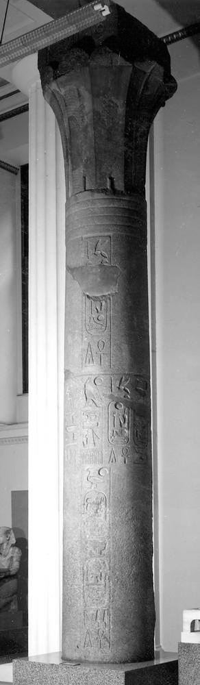 Numero Identificativo: E 10589. Oggetto: Colonna Papiriforme. Dimensioni: Altezza: 200 cm; Grandezza: 150 cm; Profondità: 115 cm; Peso: 7300 kg. Materiale: granito rosa. Datazione: Ousermaâtrê Osorkon II (contesto di fouilles) (-865 – -830). Data di acquisizione: 15/11/1889. Mittente: Naville, Henri Édouard. Tenuto da: Museo del Louvre, Dipartimento delle Antichità Egizia. Posizione attuale: Sully, [AE] Salle 324 – Le Temple, Hors vitrine. Fonte: Museo Louvre archivio Online