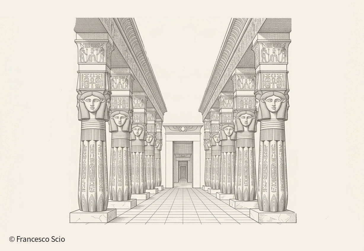 Il santuario e composto da una fila di colonne Hathoriche che sorreggono un soffitto più alto, mentre le colonne papiriformi sorreggono il soffitto più basso del santuario, procedendo dritto si arriva al Pre-Naos.