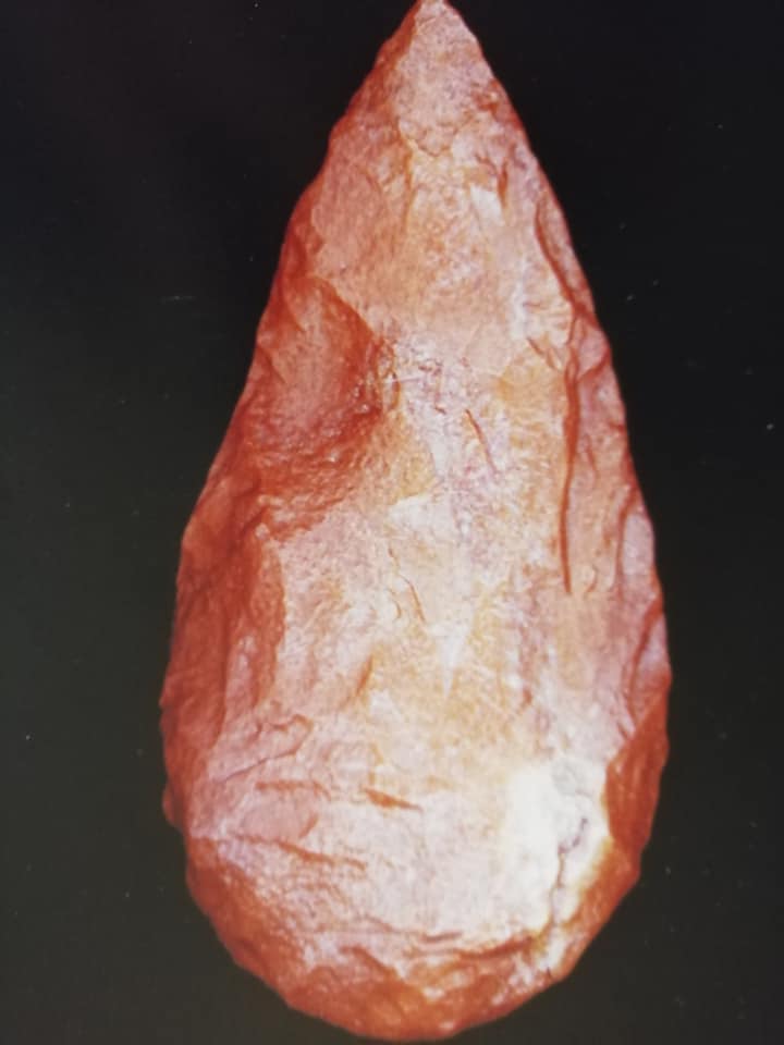 Questa amigdala acheuleana (Paleolitico inferiore), rinvenuta nel Gran Mare di Sabbia egiziano (GSS), è un manufatto multiuso. Ma al di là dell’utilità vi si osserva una simmetria che è segno del nascente senso estetico nello spirito umano. Circa 250.000 – 90.000 anni fa; quartzite da arenaria metamorfosata ; Parigi, collezione privata.