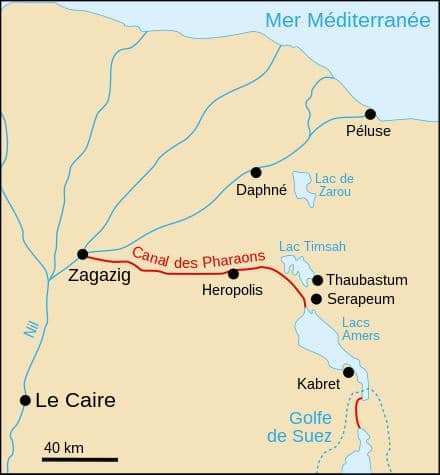 Particolari della Carta del canale dei Faraoni: tratteggiato il livello del Mar Rosso all’epoca di Sesostri III. Secondo le storie del Greco Erodoto, intorno al 600 avanti Cristo Il faraone Necao II intraprese i lavori di scavo, senza però terminarli. Il canale fu terminato da Dario Primo di Persia, che commemora la sua opera con diverse steli di granito disposte Sulle rive del Nilo, fra cui quella di Kabret, a 200 km da Pie. L’iscrizione di Dario dice: “Il re Dario ha detto: io sono persiano. Oltre alla Persia, Ho conquistato l’Egitto. Ordinai di scavare questo canale dal fiume chiamato Nilo che scorre in Egitto al mare che inizia in Persia. Quando questo canale fu scavato come io avevo ordinato, navi sono andate dall’Egitto fino alla Persia, come io avevo voluto”. Il canale fu restaurato dal faraone ellenistico Tolomeo II nel 250 a. C.