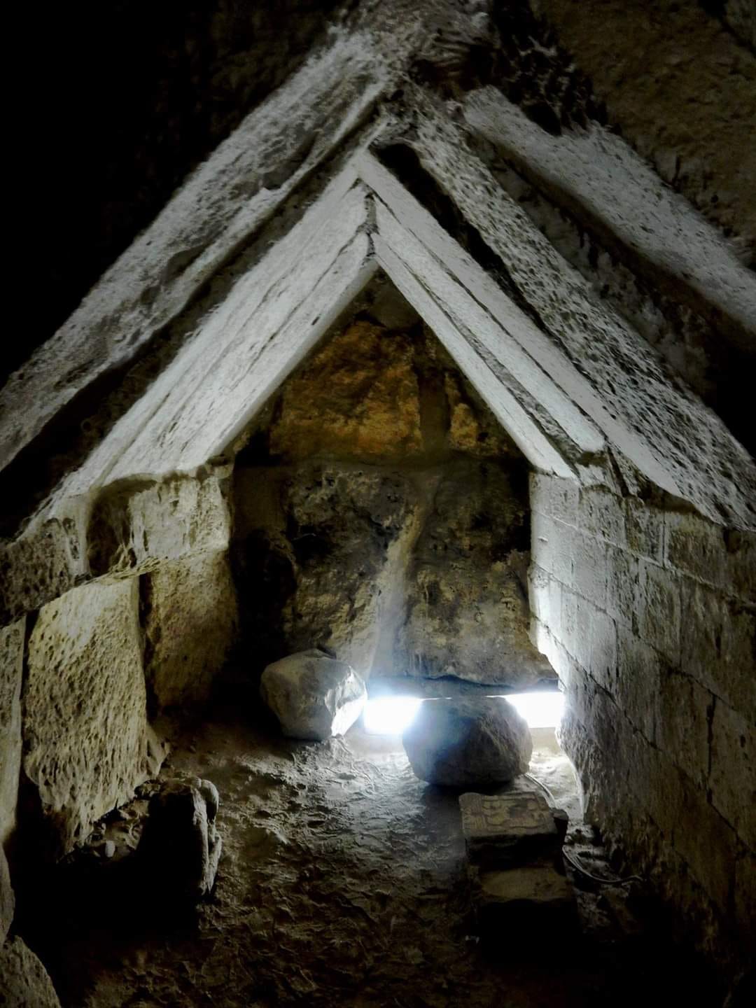 Tale struttura copriva l’imboccatura di un pozzo scavato nella sua parte superiore e poi nel terreno, dove sprofondava nella roccia per l’accesso alla substruttura che conteneva la camera in cui era deposto il sarcofago.