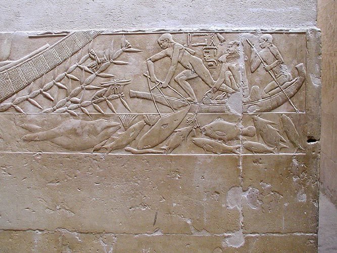 Nel vestibolo è raffigurata questa bella scena di pesca con le reti. Tra i diversi pesci rappresentati è possibile riconoscere la grande Tilapia nilotica e il Lates nilpticus. In basso, sulla destra, si riconosce un pescatore seduto sulla sua barca di papiro.