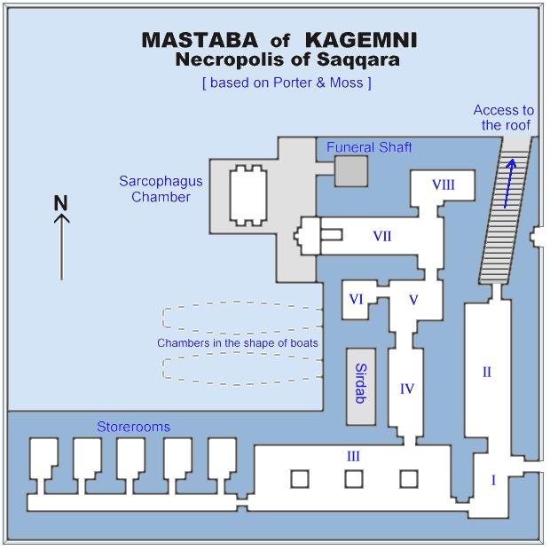 Ha l’accesso ad est, fiancheggiato da una doppia rappresentazione del defunto con i suoi nomi ed i suoi titoli sugli stipiti della porta; ha una cappella composta da sei stanze, una sala colonnata, cinque magazzini, due fosse per le barche (rimaste vuote) del tutto insolite per un privato, un serdab separato dal resto della tomba e già vuoto al momento della scoperta, un pozzo che dava accesso alla struttura funeraria sotterranea nella quale si trovava il sarcofago di Kagemni ed una scala che dava accesso al tetto, la cui effettiva funzione è ancora oggi sconosciuta.