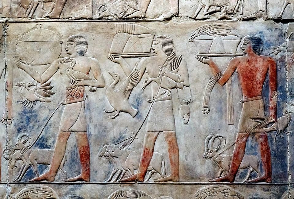 Una fila di portatori che recano grandi ceste sulla testa, colme di cibo e frutta, tenendo in mano volatili e fiori. Rappresenta la processione delle proprietà terriere del defunto e della sua famiglia