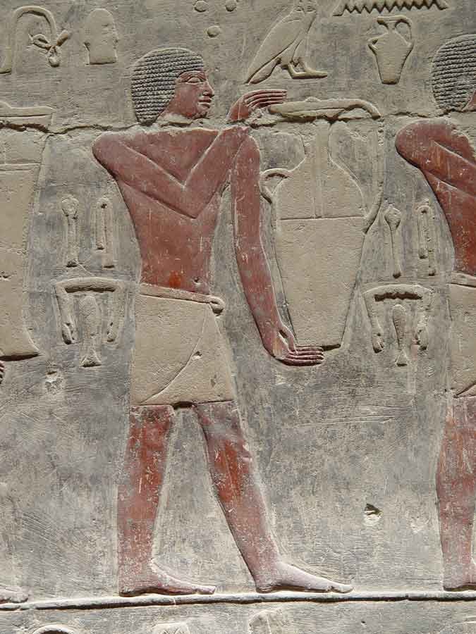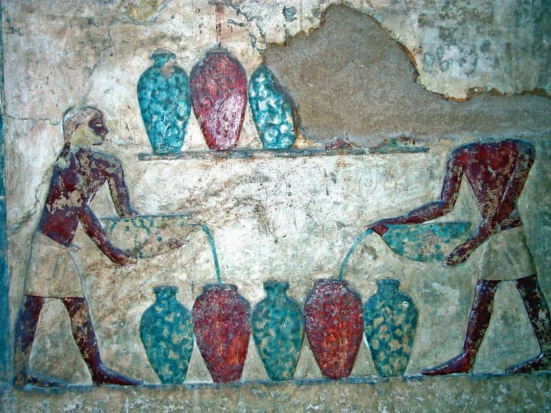 Scena abbastanza rara Nell’antico Regno, è situata sulla parete ovest è descritta la preparazione del vino, che viene versato nelle giare.