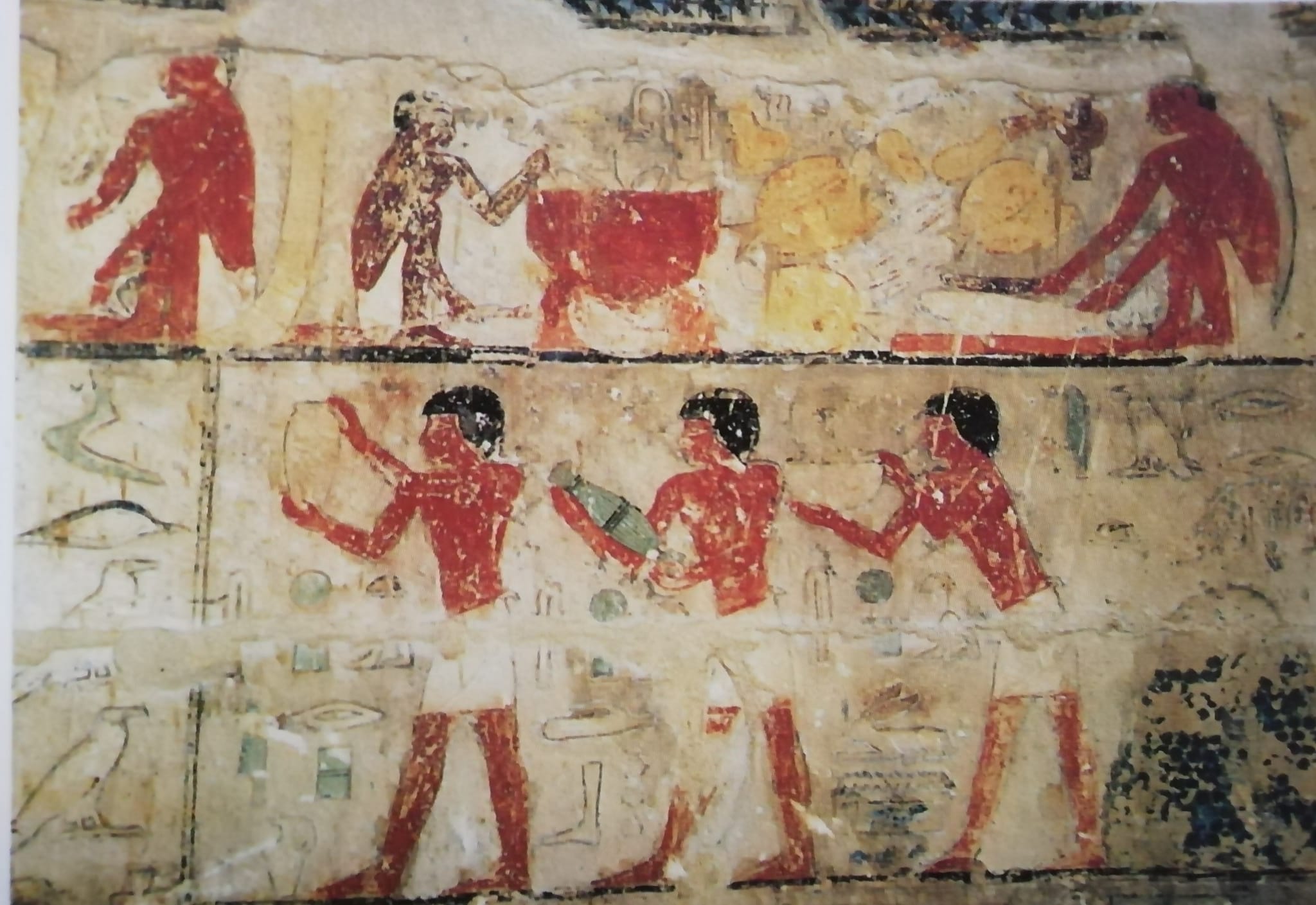 Due uomini sono raffigurati mentre sono intenti alla preparazione dei cibi e bevande. Le pitture della camera sepolcrale hanno conservato i loro colori.