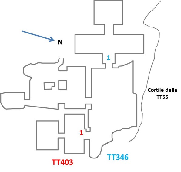 TT346 sui apre in un cortile da cui si accede anche alla TT403. Planimetricamente ripete la forma a “T” rovesciata tipica delle sepolture del periodo, ma solo nel corridoio di accesso è leggibile una scena parietale (1 azzurro in planimetria) con, in alto, un testo dedicatorio sovrastato dal defunto seduto mentre più in basso un uomo e una donna si fronteggiano[8]