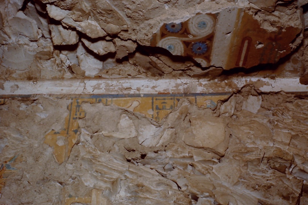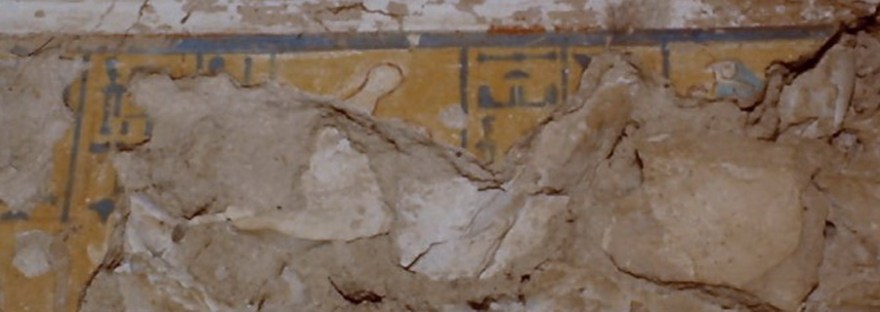 I danni strutturali subiti dalla tomba con lo slittamento di una parte della parete che “divide” i cartigli di Hatshepsut. Da: Conservation Project TT 110 (Tomb of Djehuty), El Sayed M. El Bana & Ahmed S. Shoeab (Cairo University) Khadija Adam (ARCE)