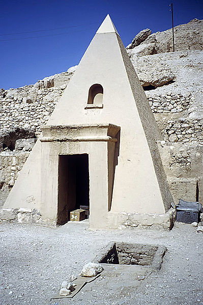 La tomba vera e propria, sita sul versante opposto della collina, era sovrastata da una piramide il cui pyramidion (oggi al Museo del Louvre di Parigi, cat. 13988) reca scene del defunto inginocchiato con inni indirizzati a Ra.