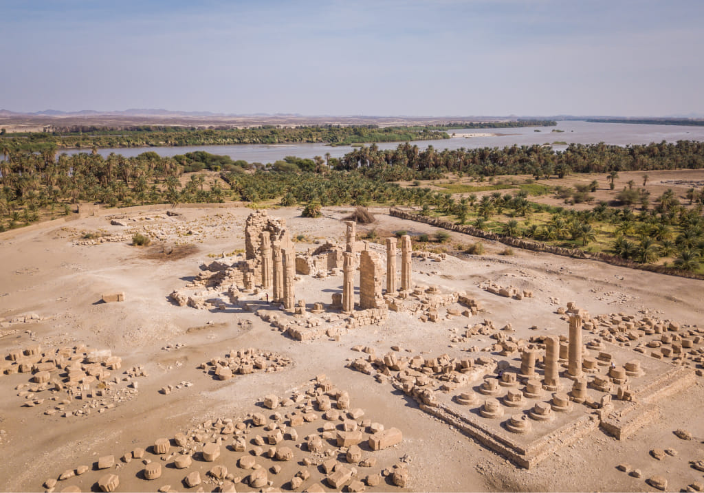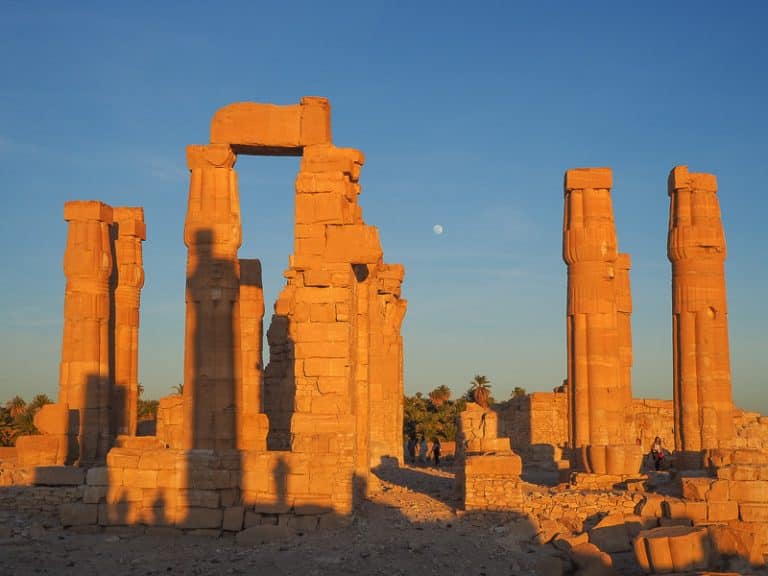 Le rovine più affascinanti del sito sono quelle del tempio in arenaria edificato per la gloria del faraone, che vi era venerato assieme al dio Amon Amenhotep III (1390-1352a.C) faraone della XVIII dinastia.
