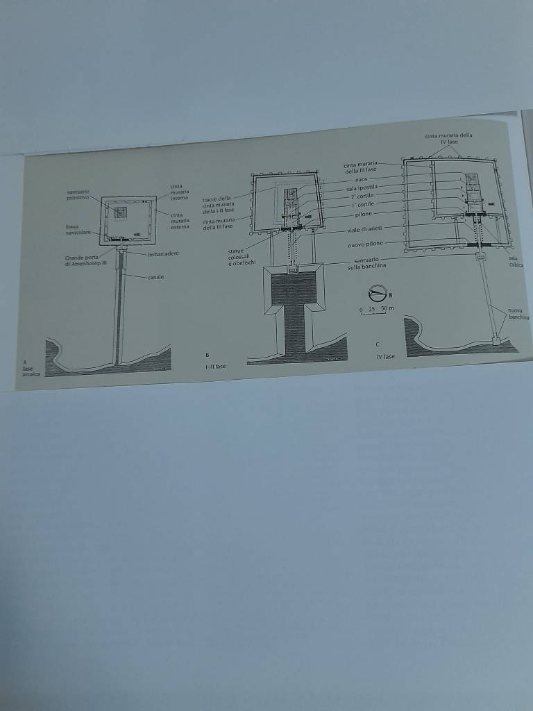 Un riassunto delle fasi di ampliamento del tempio. Nella sua fase arcaica (A) il santuario primitivo era circondato da una cinta muraria spessa e fortificata e da una cinta più esterna e sottile, davanti al cui ingresso si trovava la “Grande Porta di Amenhotep III) Nebmaatra che ascolta il supplicante” e subito oltre l’imbarcadero per il canale che portava al Nilo. Successivamente I fase B) il santuario primitivo fu in parte modificato per diventare il sacrario del nuovo tempio: furono costruiti davanti una sala ipostila e un cortile con colonne chiuso da un pilone; fu edificata una nuova cinta muraria di 135 m di lato; una nuova banchina fu costruita di fronte alla Grande Porta. Nella fase II fase il pilone divenne una parete cui si appoggiava un nuovo cortile, chiuso da un nuovo, più grande pilone. La fase III vede il cortile rivestirsi di colonne papiriformi su tutti I lati, mentre le pareti vengono decorate con scene della festa-sed. Davanti al pilone furono poste sei statue colossali e due obelischi; fu aggiunto un santuario su una nuova banchina che dava su un vasto bacino. Nell’ultima fase (IV C) davanti al pilone fu aggiunta una sala cubica sostenuta da quattro colonne palmiformi; rimossi gli obelischi, venne creata una rampa d’accesso fiancheggiata da due statue di falco. Una nuova banchina fu costruita sull’antico bacino. (Da M.Schiff Giorgini) – Disegno dal libro del Prof Damiano