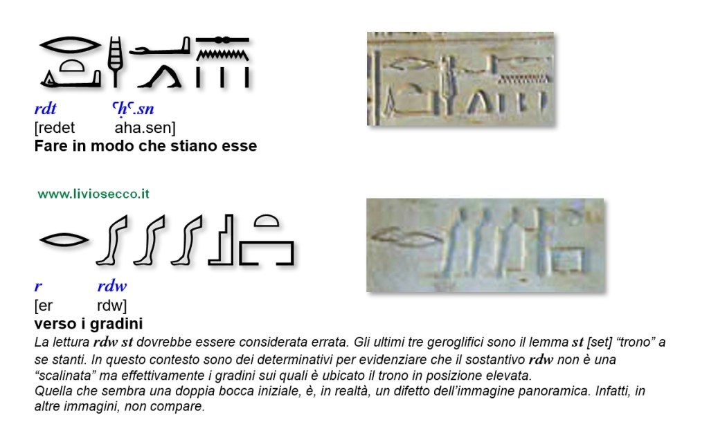 L’immagine panoramica sulla quale lavoriamo non è perfettissima. Si tratta di un assemblato panoramico con una certa serie di errori che compromettono parzialmente la perfetta lettura dei geroglifici. Qui, tra l’altro, precisiamo che la traduzione dei testi epigrafici fatta usando delle immagini fotografiche è difficoltosa perché le immagini aiutano piuttosto gli archeologi e gli egittologi non certo i filologi.