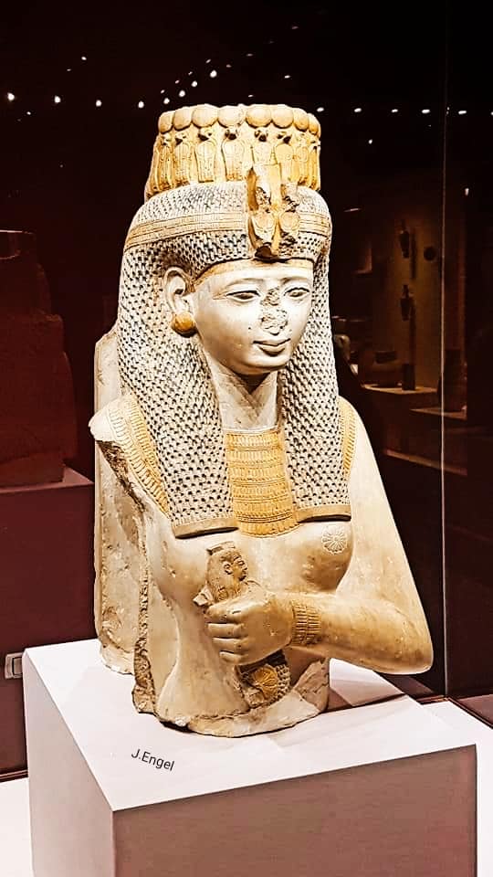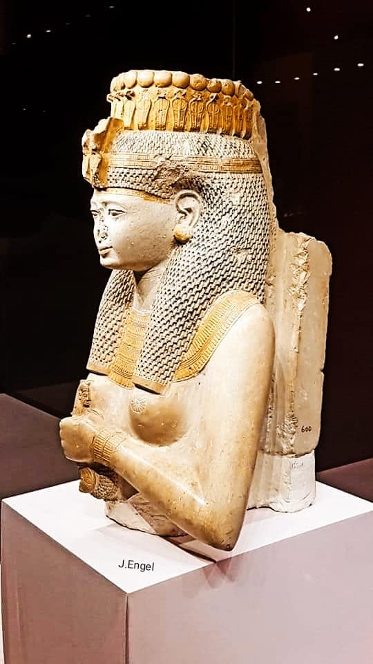 Behind her is the goddess Hathor.