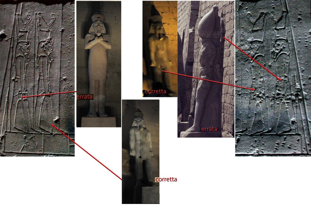 In alto a sinistra, il principe su di un carro da guerra. A destra, il principe raffigurato alla destra del re nella famosa statua di Ramses II, al Museo Egizio di Torino. In basso a sinistra, il principe raffigurato tra le gambe del padre (non gli arriva nemmeno al ginocchio) nel colosso all’ingresso del tempio grande di Abu Simbel