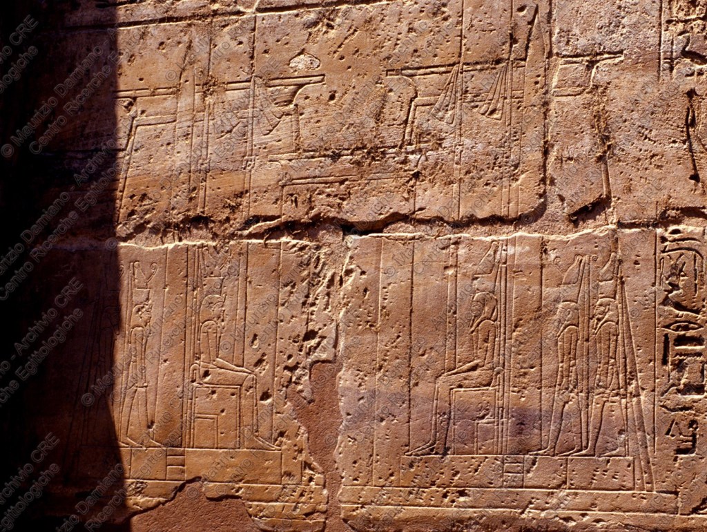 Davanti al rilievo che ricorda quella cruenta battaglia nella piana di Qadesh[5], User-Maat-Ra Setpenra Ramses[6], secondo di questo nome, l’amato di Amon, il Grande Re delle Due Terre, Colui che regna sul Giunco e sull’Ape, risente ancora nelle orecchie quelle urla e, involontariamente, le dita della mano destra si atteggiano a stringere la cocca e la corda del suo possente arco… in quella, il primo raggio del sole improvvisamente esplode all’interno delle scure profondità ed illumina i quattro dei che lo attendono sul fondo del tempio[7] e che simboleggiano il mondo delle Due Terre: Ptah il “creatore”, in onore dell’antica Mennefer[8], Amon per Niwt, Ra-Horakti per On, e lo stesso Ramses che simboleggia l’intera Terra di Kemi.