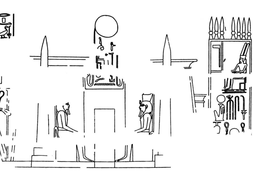 La raffigurazione dello stesso pilone in una prima fase (parete esterna ovest), in cui figurano ancora solo le prime due statue. Sul lato destro si vede il nome del tempio.