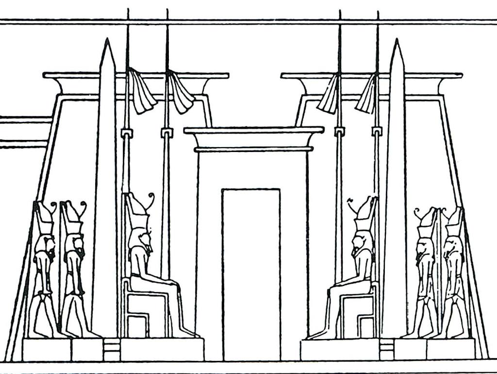Si può ammirare nel dettaglio, sulla sinistra, la sagoma della facciata del tempio come doveva apparire all’epoca del suo maggior splendore, con i due obelischi, i pennoni con gli stendardi e le sei statue colossali del re; purtroppo oggi è appena percepibile…
