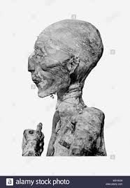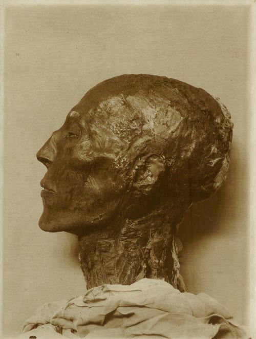 Nelle fotografie il teschio con la ferita da mazza, la ricostruzione del volto del principe ed i visi delle mummie di Seti I, Ramses II e Merneptah, dalle quali si notano il mento ed il naso particolari.