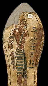 Le calzature che vi mostro portano raffigurati due nemici dell’Egitto. Questa rappresentazione ha un notevole significato magico poiché essa è riportata sulla suola e permette al sovrano di calpestare i suoi avversari ad ogni suo passo come è dimostrato dalla didascalia che è scritta accanto alle figure. Perciò il re, mentre cammina, calpesta magicamente i nemici dell’Egitto rendendoli inoffensivi.
