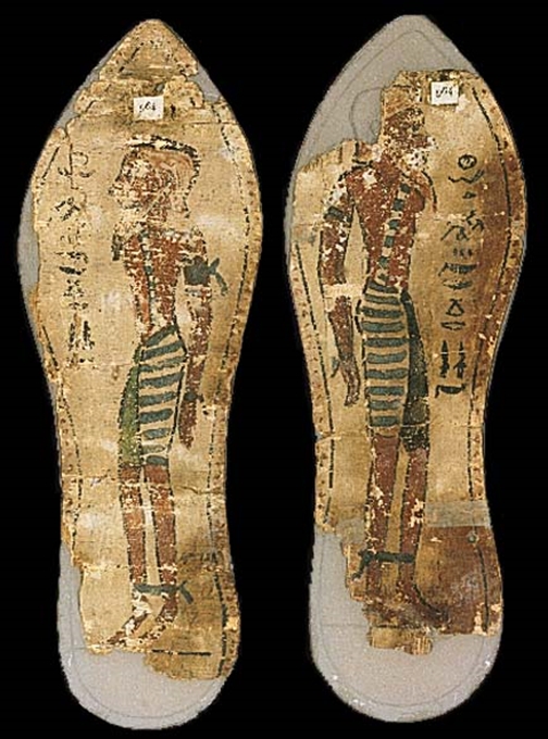 Gli Egizi, quanto alle calzature, indossavano esclusivamente i sandali che avevano una funzione accessoria tutt’altro che indispensabile. Pur fabbricando sandali dal periodo predinastico, gli Egizi camminavano perlopiù scalzi, le donne non ne facevano uso e gli uomini li indossavano raramente e solo in occasione di visite a qualcuno. I nobili avevano un servo incaricato di “portare i sandali” che venivano indossati, curiosamente, solo una volta giunti a destinazione. Da questa usanza derivava l’incarico di corte, molto prestigioso, di “PORTATORE DEI SANDALI DEL RE” (vedi la tavolozza di Narmer). Nel Medio Regno solo i poveri non possedevano calzature mentre tutti gli altri le avevano a portata di mano anche se le indossavano sempre e solo a destinazione. Era buona educazione non mostrarsi calzati in presenza di persone di rango più elevato mentre per i cortigiani era un vanto rimanere calzati in presenza del sovrano. Nel Nuovo Regno l’uso delle calzature si generalizzò. Esse consistevano in una semplice suola di scorza di palma, di fibre di papiro o, più raramente, di cuoio, alla quale erano attaccati due o tre lacci dello stesso materiale. A partire dalla XVIII dinastia i sandali potevano essere provvisti di una punta ricurva.