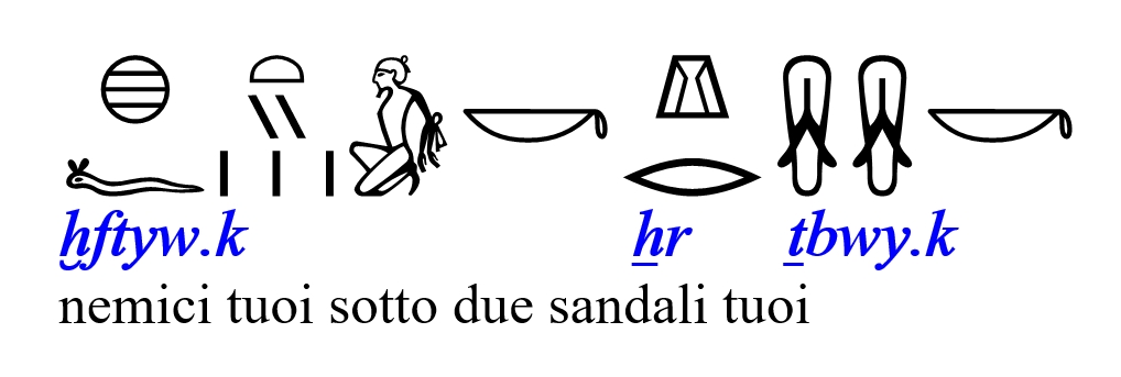 TRASLITTERAZIONE xftyw.k Xr Tbwy.k PRONUNCIA [kefetiu.ek ker ʧebui.ek] TRADUZIONE LETTERALE nemici tuoi sotto due sandali tuoi TRADUZIONE COLLOQUIALE I tuoi nemici sono sotto i tuoi sandali.