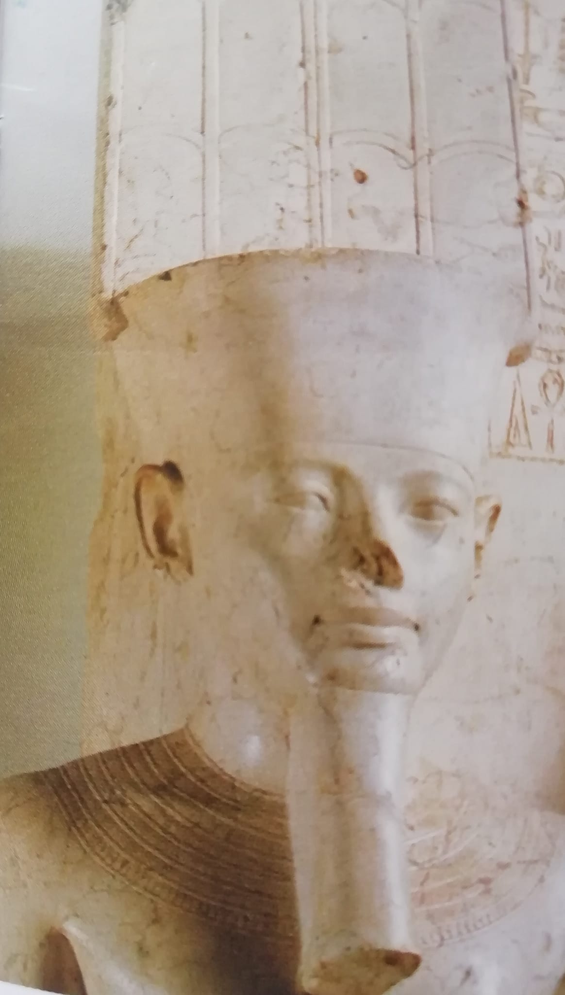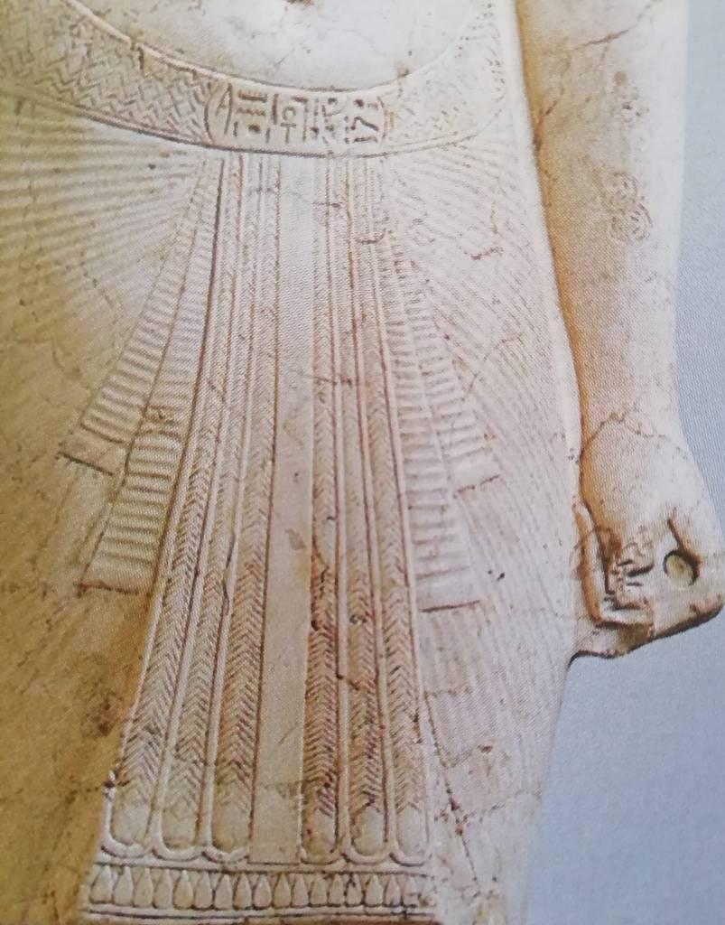 Le fitte pieghe della stoffa si incrociano all’altezza della vita creando un raffinato gioco di chiaro-scuri ulteriormente impreziosito dal davantino su cui si trova una colonna di geroglifici.