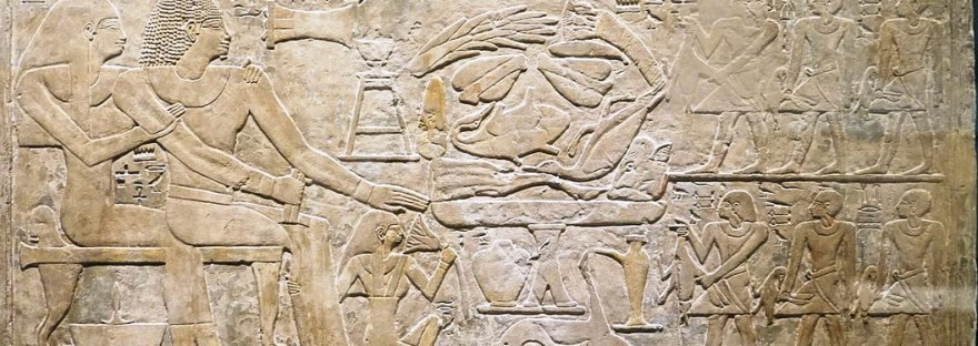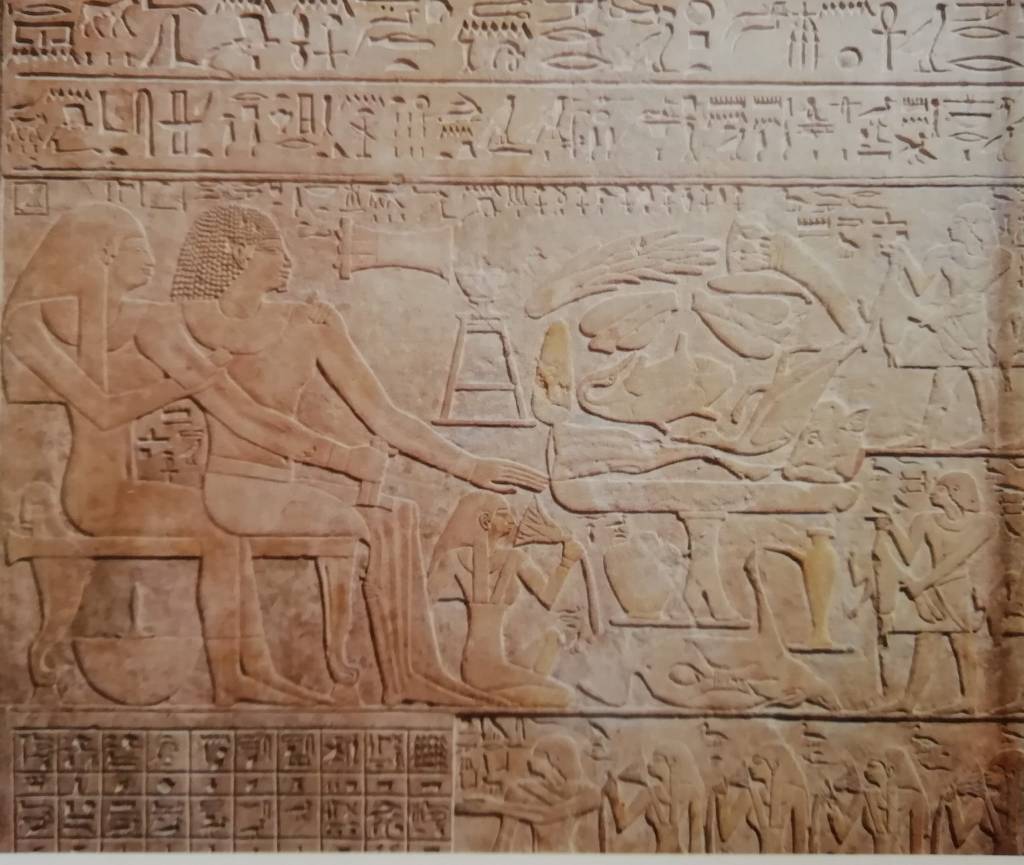 Una tavola d’offerta, colma di carni e verdure, separa il gruppo familiare da una figura in piedi, identificata dall’iscrizione geroglifica sovrastante, come Ipy, la nuora del defunto.