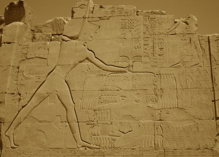 Merenptah è figlio e successore di Ramses II. La vasta iscrizione all’interno del Tempio di Karnak (nell’immagine) descrive la campagna militare del faraone contro i tentativi di invasione via terra da ovest da parte dei Libici, nell’occasione alleati con i popoli del mare (circa 1208 a.C.).