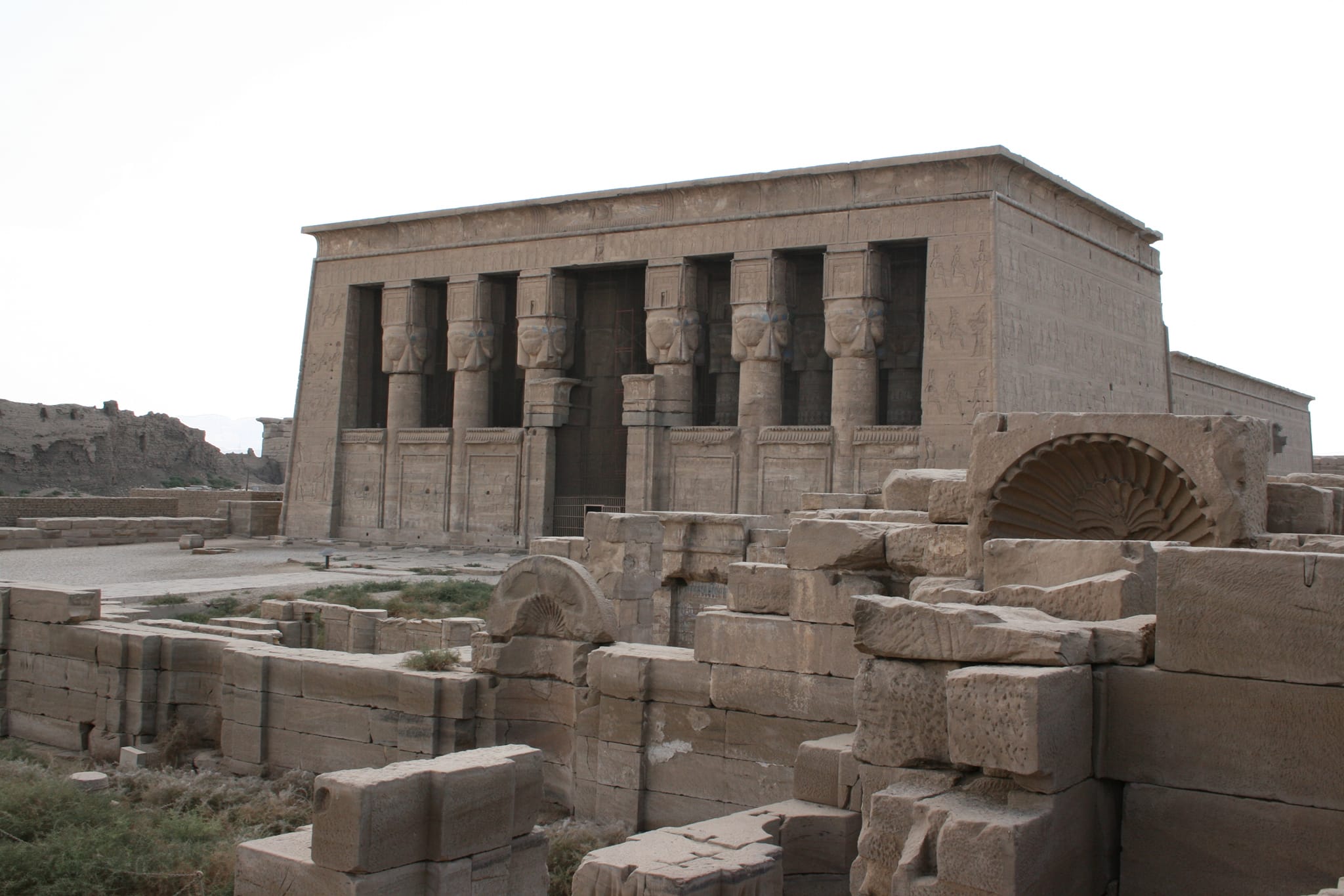 Il suo monumento più celebre è il tempio di Hathor, racchiuso entro un muro di cinta di mattoni crudi, misura 280 x 290 metri di perimetro, spesso 10 metri e alto 10.