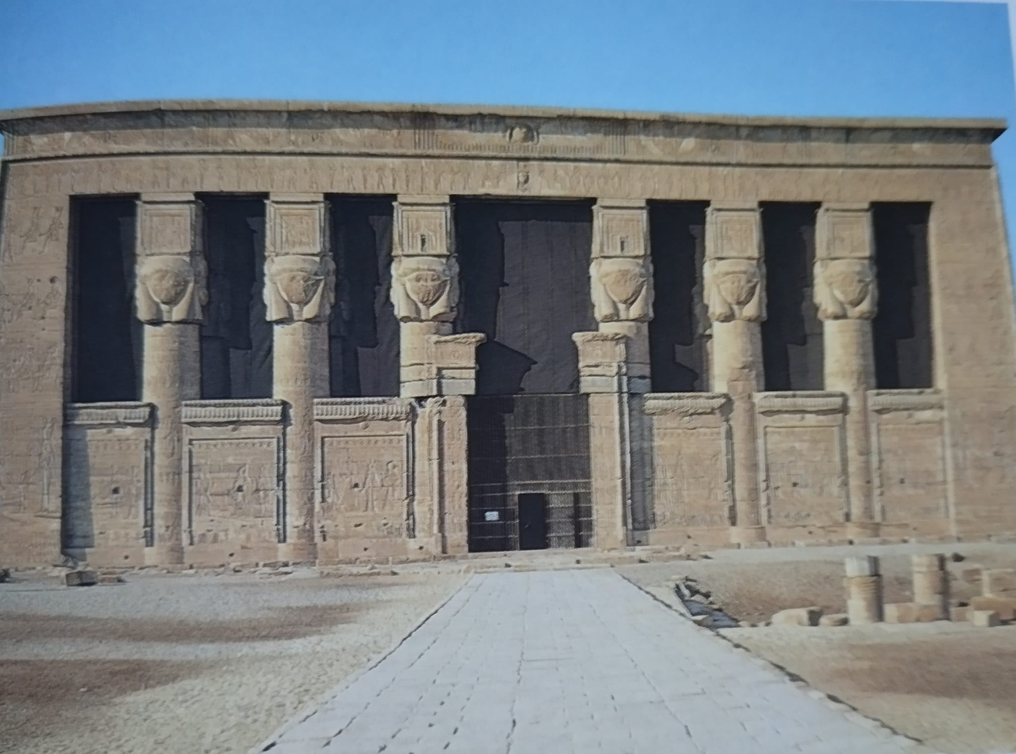 La facciata è impressionante: 35 metri di larghezza e 12,5 di altezza, formata da sei colonne a sistro con capitello hathorico, separate da muri di schermo decorati e una porta centrale.
