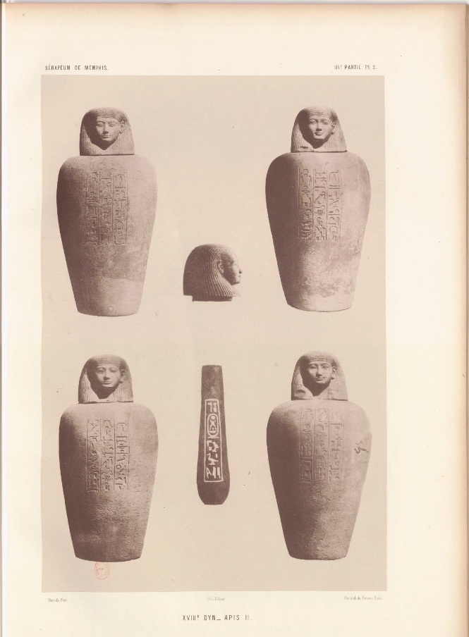 A sinistra: i canopi di Apis I (morto sotto Amenophis III). A destra: I canopi di Apis II (morto sotto Tutankhamon – o Amentouonkh come veniva interpretato il cartiglio all’epoca)
