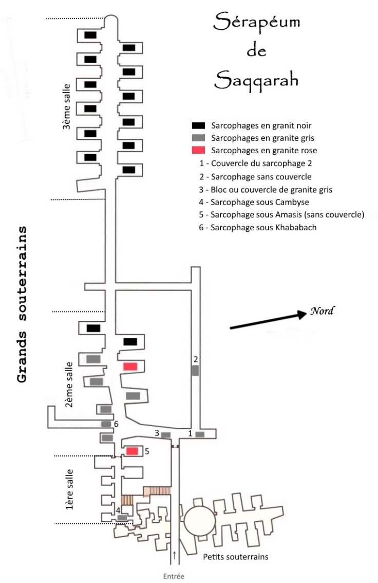 La sequenza “ufficiale” dei sarcofagi in granito parte dall’anno 23 del regno di Amasis (XXVI Dinastia, circa 545 BCE) con la stele attualmente al Museo del Louvre (che vedremo in dettaglio a parte).È molto probabile che i sarcofagi di granito siano stati preparati vicino alle cave di Assuan, abbiano preso la direzione di Menfi via fiume e poi portati nelle rispettive nicchie. Su una stele in demotico viene riportato che il trasporto di un sarcofago di granito da Menfi al Serapeum (più o meno 8 km) richiese 19 giorni, di cui 5 giorni di riposo.