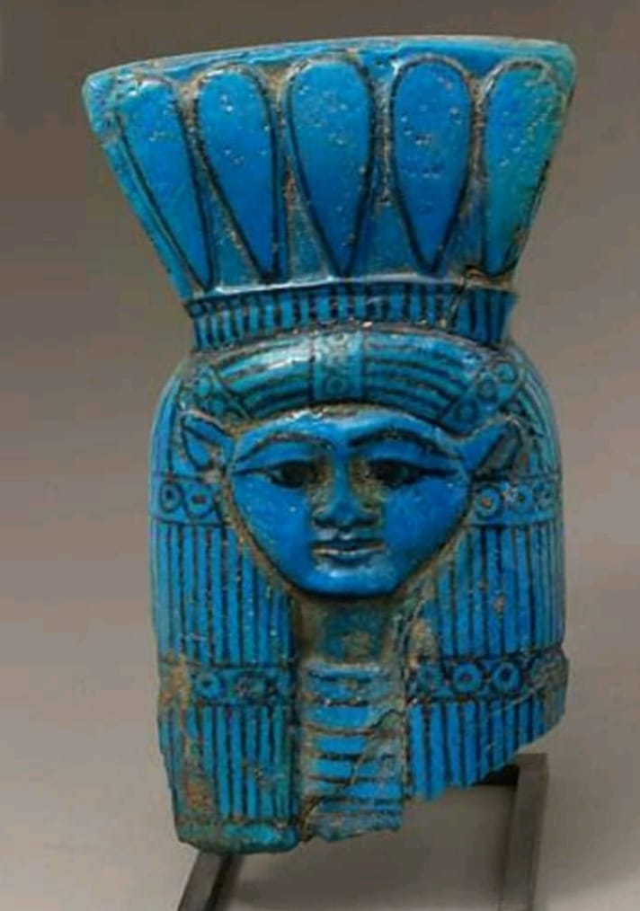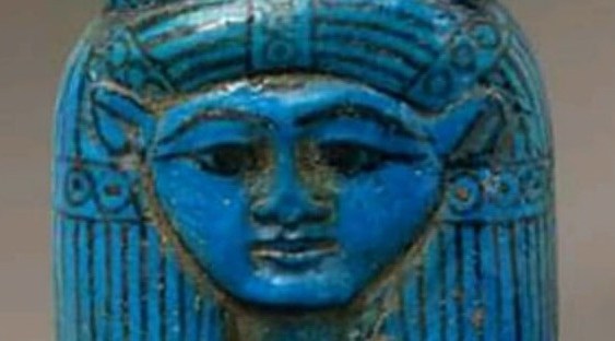 Dea della prima cataratta: da Elefantina al Louvre Questa graziosa testina di terracotta blu, sebbene assomigli fortemente a una rappresentazione di Hathor, è in realtà nell’immagine della Dea Anouket (Anoukis).