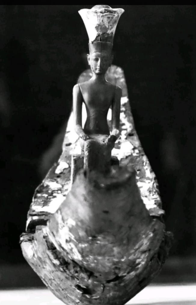 Dal tempio di Satet, Elefantina. La Dea con la sua barca processionale. Legno di persea dorato .XIX dinastia. Museo del Louvre Paris.