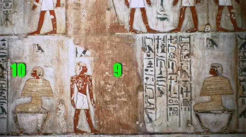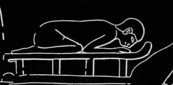 The sem- priest is the figure wrapped in a cloak and curled up on a seat which has curved legs, or a bed. This scene represents the sem- priest in two functions, “asleep” and “awake”. According to Budge, it is in the first “sleep” state during which he sees “in all its forms” the type of statue that must be made for “his father” (i.e. of the deceased) in all its forms”. In addition, he also sees invertebrates (insects and spiders). It has been suggested that the sem-priest would act as the first Egyptian magician and the entire scene would correspond – in an expected shamanic manner to a trance during a ‘false sleep’. This ritual could be linked with the mysterious Tekenu.