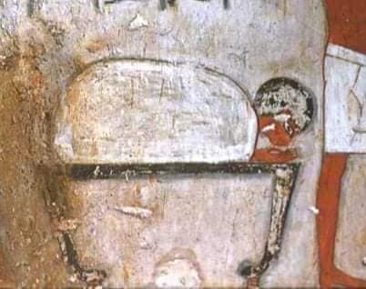 Relief representation in the 18th Dynasty Tomb of Renni at El Kab showing the tekenu as a shrouded man (face exposed) sitting upright (?) on a sledge pulled by two men (only one seen here).