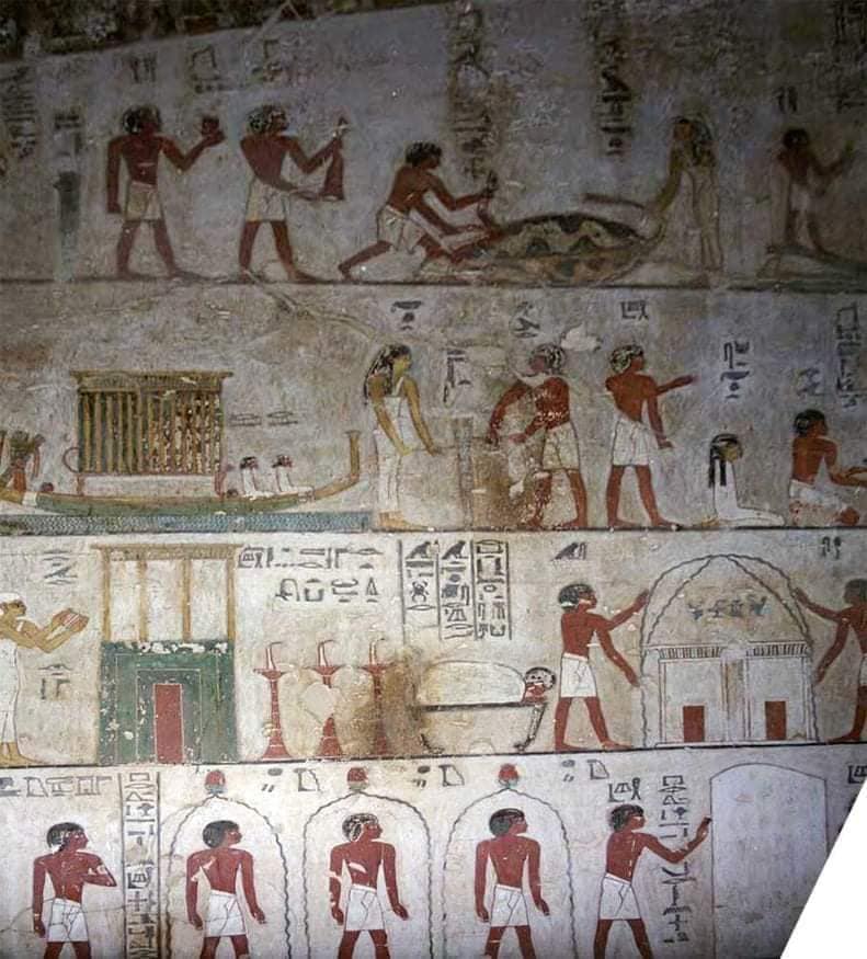 On the south wall of the tomb’s entry passage, he is shown lying on a couch with only his head and hand exposed.