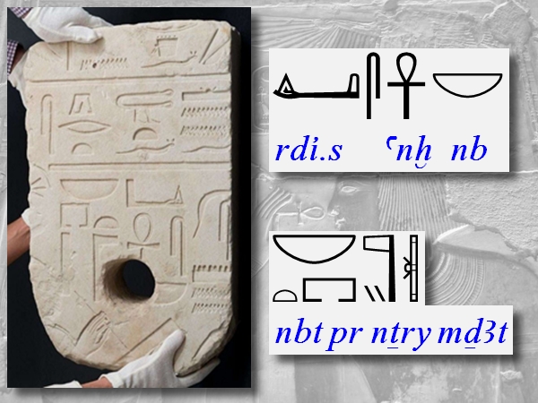 Sempre sullo stesso registro, più a sinistra, leggiamo una qualifica della dea Seshat: – il cestino senza manico è il bilittero “nb” [neb] – la pagnotta è il monolittero “t” [et] – la mappa della casa è il bilittero “pr” [per] – la bandierina è il trilittero “nTr” [neʧer] – i tratti obliqui sono il monolittero “y” [i] – il papiro arrotolato è il plurilittero “mDAt” [meʤat]