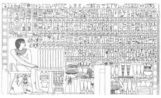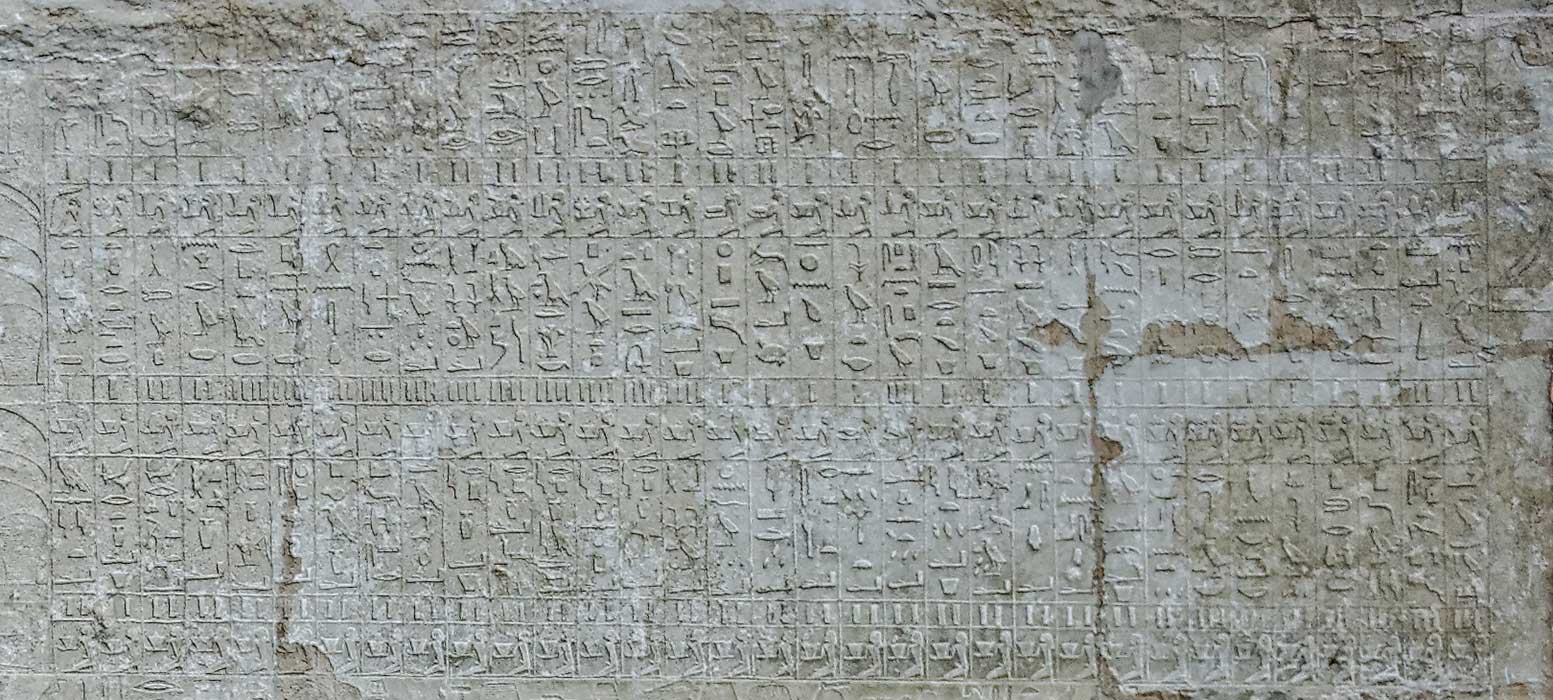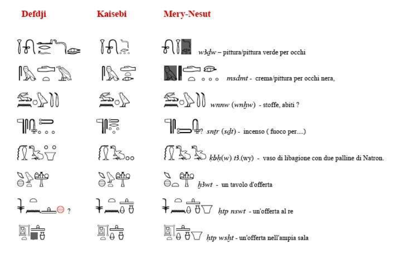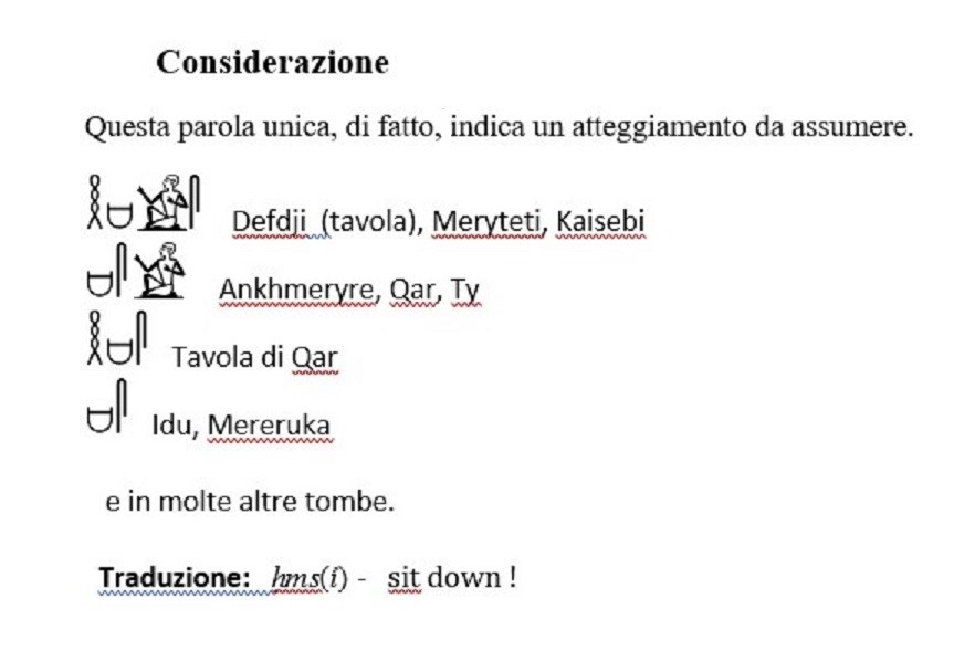 Ps. Da notare una citazione di offerta molto rara che si riscontra pochissime volte nei testi egizi, sia come parola che come rappresentazione. Si tratta di “pesci” mai (o rarissimamente) riprodotti o citati (come qui) nelle tavole d’offerta.
