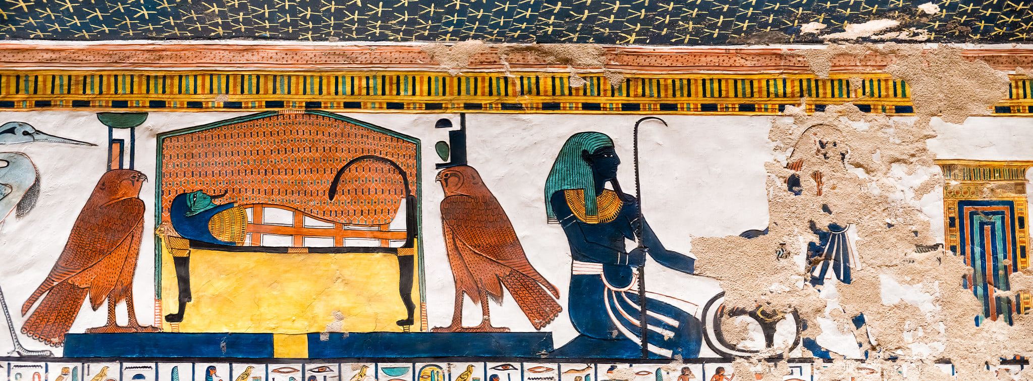 Il nuovo faraone Ay (a destra) effettua la cerimonia dell’Apertura della Bocca sulla mummia di Tutankhamon (a sinistra). Tomba di Tutankhamon.Da Wikipedia