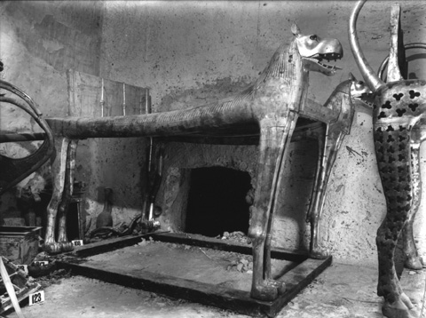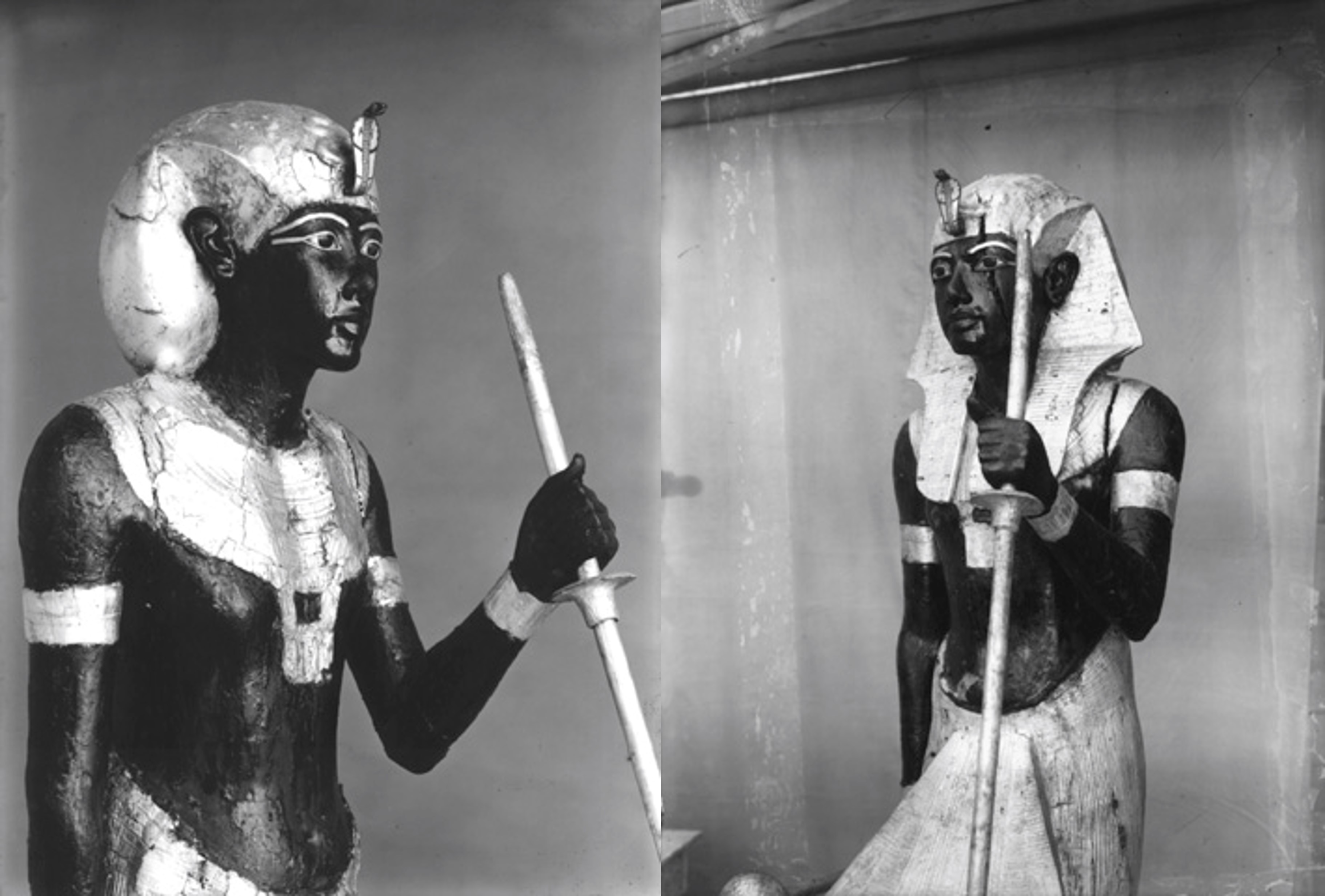 La due statue ancora in situ dopo il parziale svuotamento della tomba. Carter e Carnarvon decisero di lasciarle al loro posto fino all’apertura del passaggio alla Camera Sepolcrale in maniera simbolica: i guardiani ancora al loro posto a vigilare che lo scavo fosse compiuto con il rispetto dovuto al Faraone. Probabilmente la decisione fu di Carter, avvezzo alla “scenografia” locale, per rendere la cerimonia di apertura ancora più impressionante. L’effetto fu più tardi descritto come “un’atmosfera straordinaria di presenza divina” (Hornurg, 1982)