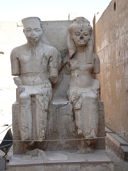 Statua colossale che rappresenta Tutankhamon e Ankhesenamon nelle vesti degli dèi Amon e Mut. Successivamente usurpata da Horemheb. Tempio di Luxor.Da Wikipedia.