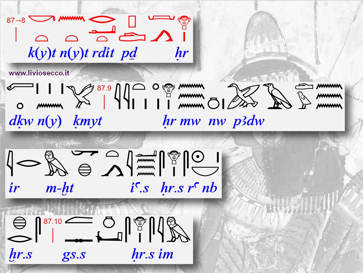 Visto che il post ha una valenza didattica per coloro che si impegnano in filologia egizia, ho aggiunto una riga supplementare con la traduzione letterale che precede quella colloquiale.