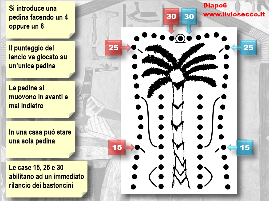 Alcune dotazioni funerarie prevedono la fornitura di una tavoletta per gli oli sacri. Normalmente si tratta di una pietra di alabastro lavorata in piano con sette alveoli in corrispondenza dei quali è scritto, in geroglifico, il nome di un olio sacro. Gli oli sacri erano importantissimi nella ritualità egizia perché permettevano di ridare alla mummia del defunto l’uso dei cinque sensi nell’Aldilà.