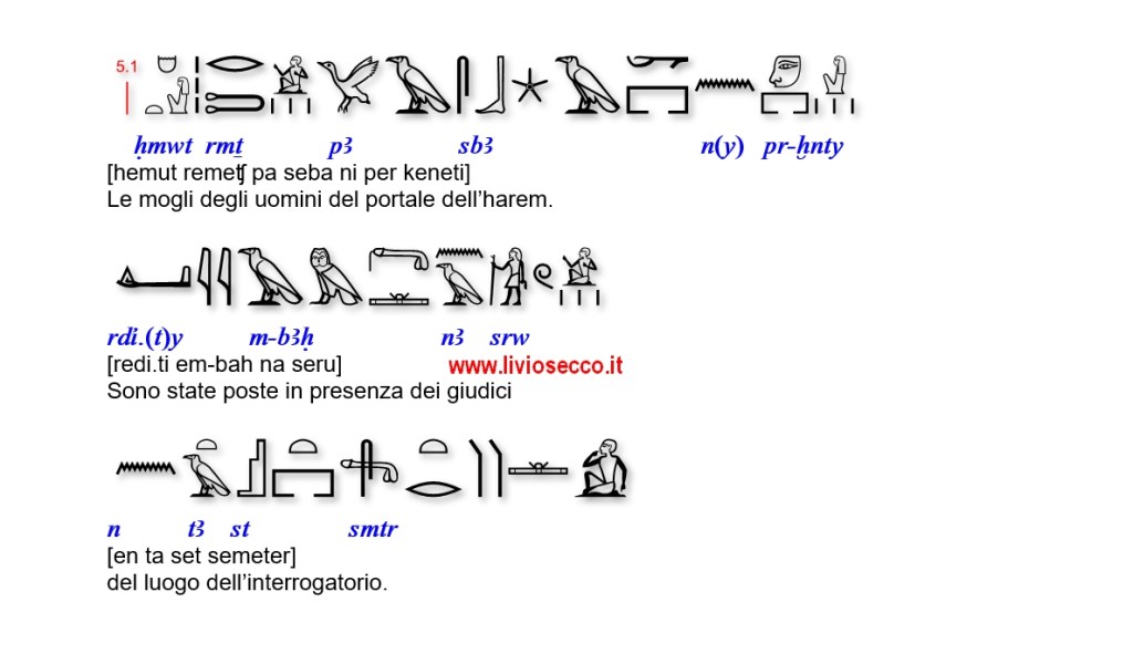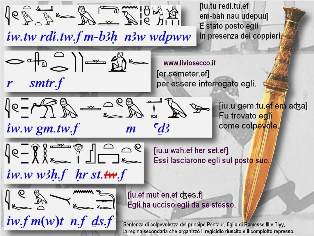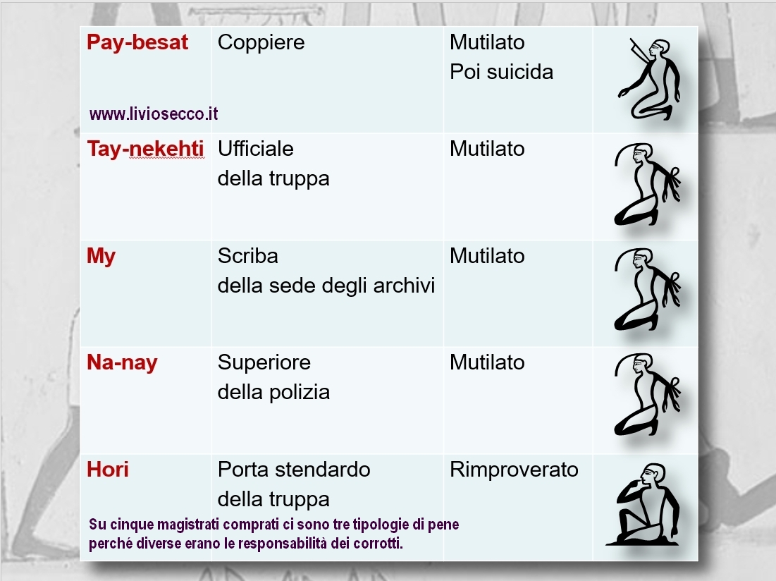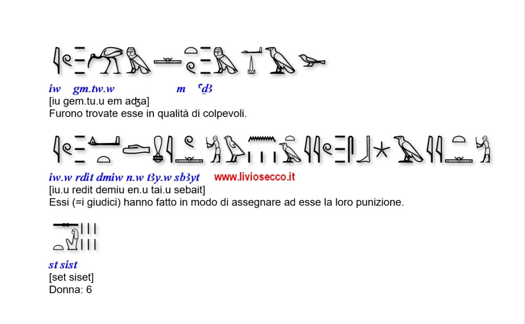 Quello che qui esemplifico è la sentenza, a margine del processo contro i cospiratori di Ramesse III, a carico delle ancelle della regina secondaria Tiyy. Ella, madre di Pentaur, figlio carnale di Ramesse III, cospirò con molti altri nobili importanti e di primo piano per il regicidio affinché sul trono salisse il figlio. Il regicidio fu consumato ma sul trono salì Ramesse IV che organizzò la repressione. La regina non poteva contattare i cospiratori esterni all’harem regale in prima persona perché i suoi movimenti non sarebbero passati inosservati. Come agenti di collegamento pensò bene di usare le proprie ancelle che avevano, evidentemente, maggiore libertà di spostamento. Nel testo non è dettagliato il supplizio, ma è indubbio che fu di tipo capitale. Normalmente si procedeva per impalamento.