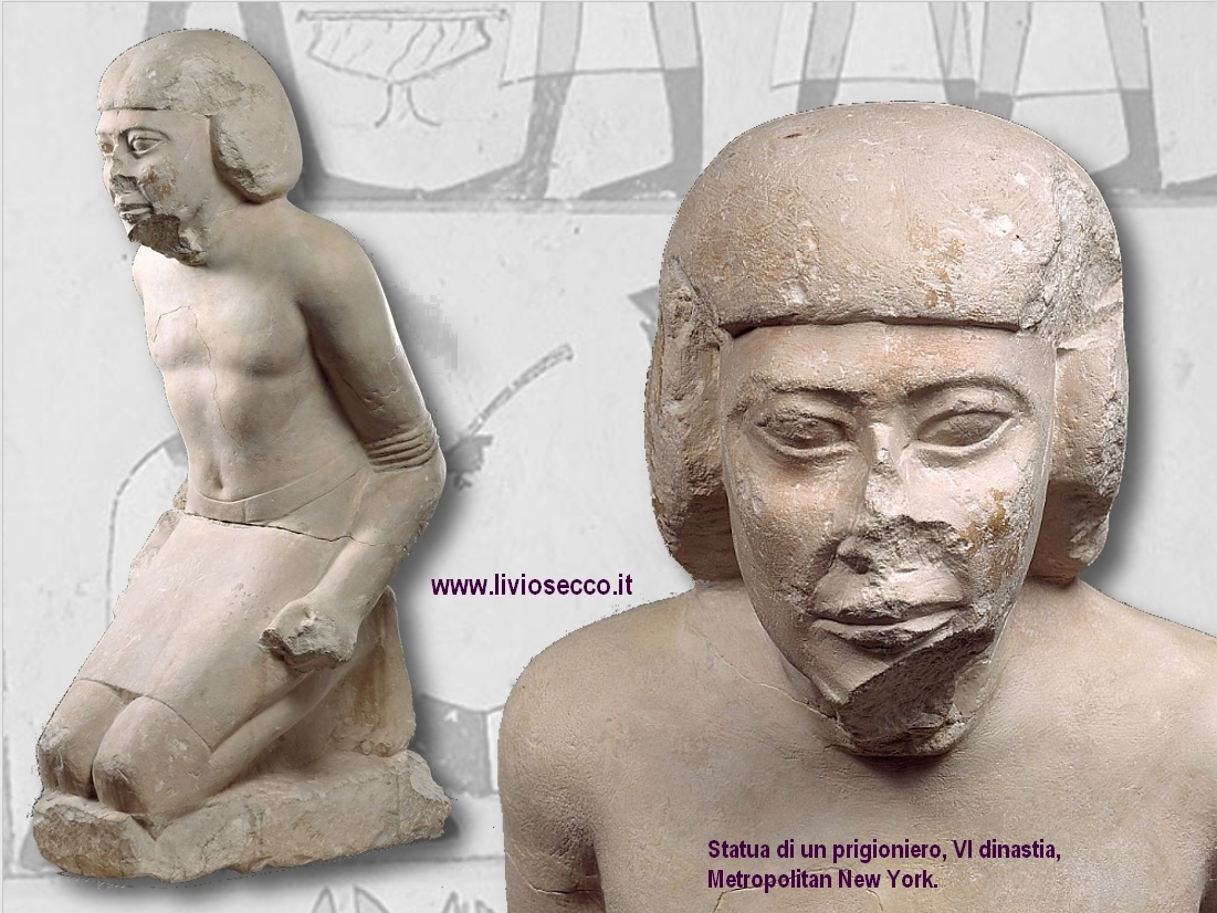 I prigionieri portano degli steli di loto e di papiro attorno al collo; il loto dell’alto Egitto per i Nubiani e il papiro del basso Egitto per gli Asiatici e i Libici.